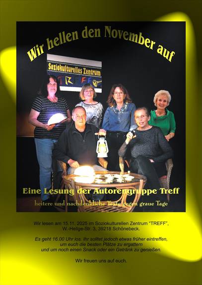 Die Autorengruppe “Treff” hat sich wieder zusammengefunden und möchte mit ihrer Lesung „Wir hellen den November auf“ Licht in diesen trist-grauen Monat bringen. Die ehemaligen und neuen Schreiberlinge treffen sich seit geraumer Zeit einmal im Monat im SKZ TREFF, um ihrer Leidenschaft zu frönen. Aus selbst gestellten Themen entstanden mittlerweile vielfältige Geschichten aus dem Alltag oder der Fantasie. Eine Jede im ganz individuellen Stil ihres Schöpfers. Diese wunderschöne Kollektion von kurzweiligen Geschichten wartet nun darauf gelesen, geteilt, gehört und miterlebt zu werden. Lassen Sie sich einladen zu einem gemütlichen Nachmittag mit kleinen Knabbereien und großen Emotionen. Die Lesung findet am Samstag, dem 15. November 2025, um 16 Uhr im Soziokulturellen Zentrum Treff in der Wilhelm-Hellge-Str. 3 in Schönebeck statt. Ab 15.30 Uhr werden die Türen zur besten Platzsicherung geöffnet. Der Eintritt ist frei. Plätze können auch im Voraus unter 03928-67522 oder info@skztreff.de reserviert werden.