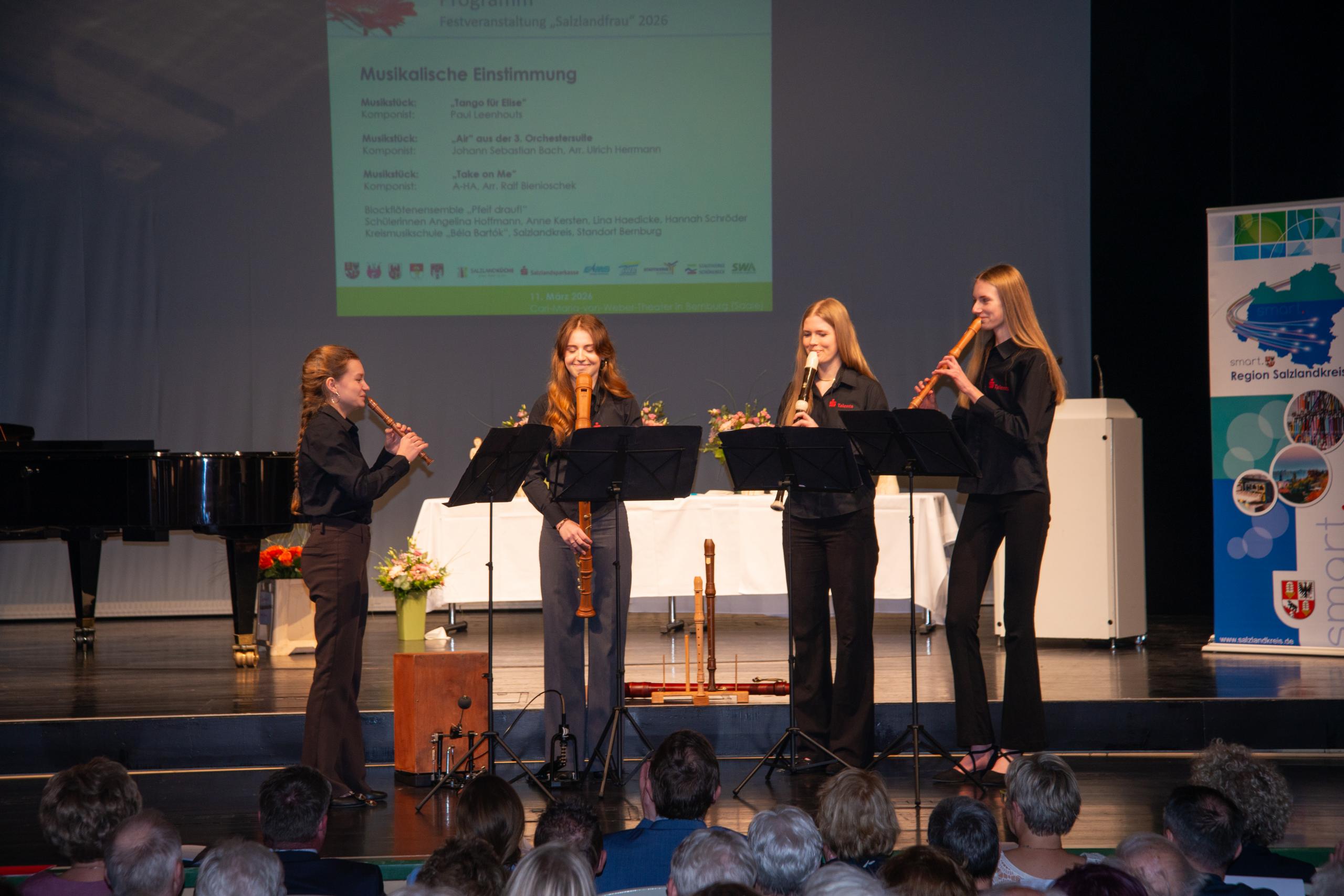 Finanzielle Unterstützung leisteten zudem die Stadtwerke Bernburg, Aschersleben, Schönebeck und Staßfurt sowie die EMS Energie Mittelsachsen. Die Veranstalter danken allen Sponsoren, die mit ihren großzügigen finanziellen Zuwendungen maßgeblich dazu beigetragen haben, dass die Ehrenpreisverleihung 2026 wieder ein Erfolg wurde. Die Festveranstaltung wurde durch die Oberbürgermeisterin der Stadt Bernburg, Dr. Silvia Ristow, mit anerkennenden Worten eröffnet. Im Anschluss richteten Landrat Markus Bauer, die Landesbeauftragte für Frauen-und Gleichstellungspolitik des Landes Sachsen-Anhalt, Sarah Schulze, sowie das stellvertretende Vorstandsmitglied der Salzlandsparkasse, Stefan König, ihre Grußworte an die Gäste der Veranstaltung. Danach wurden die Laudationen für die Salzlandfrauen von den jeweiligen Oberhäuptern der Städte verlesen, in denen die Preisträgerinnen wohnhaft sind. Für das musikalische Rahmenprogramm sorgten das Blockflöten-Ensemble „Pfeif drauf!“ der Kreismusikschule „Béla Bartók“, Standort Bernburg, sowie der „Cantolino Jugendchor“ des Bernburger Gymnasiums „Carolinum“ unter der Leitung von Ronny Strübing-von Tenspolde. Mit Kaffee, einem wunderbaren Kuchenbuffet und angeregten Unterhaltungen klang der Nachmittag aus.