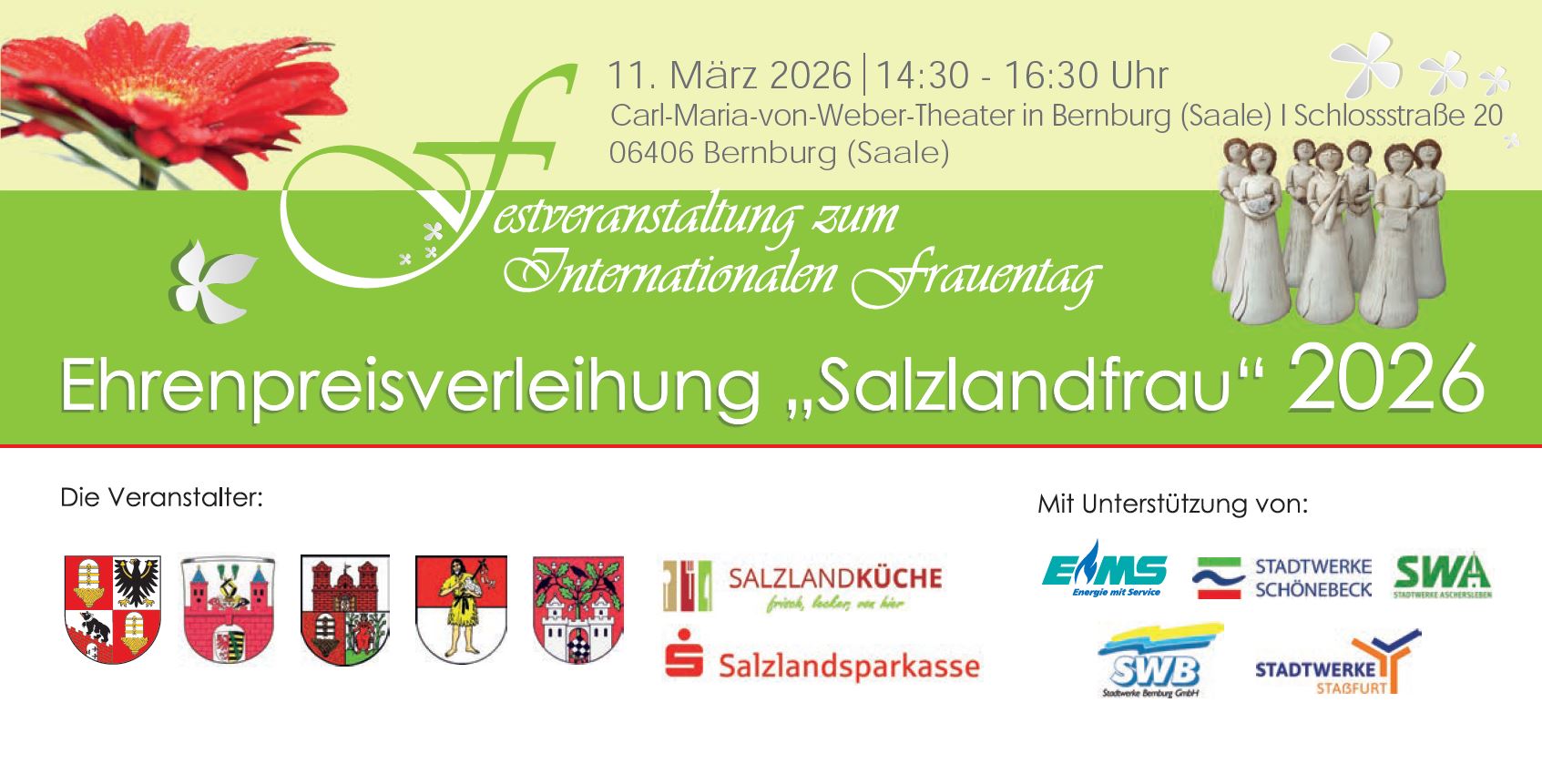 Die diesjährige Ehrenpreisverleihung „Salzlandfrau“ 2026, zu der alle Bürgerinnen und Bürger ganz herzlich eingeladen sind, wird am Mittwoch, 11. März 2026, um 14:30 Uhr im Carl-Maria-von-Weber-Theater, Schlossstraße 20 in 06406 Bernburg(Saale) stattfinden. Zum nunmehr 16. Mal werden im Rahmen einer Festveranstaltung anlässlich des Internationalen Frauentages besonders verdienstvolle Frauen für ihr herausragendes ehrenamtliches Engagement in den Bereichen Gesellschaft, Soziales, Kultur, Sport, junges Engagement sowie Lebenswerk mit dem Ehrenpreis „Salzlandfrau“ ausgezeichnet. Die eingegangenen Nominierungsvorschläge zeigen, dass sich zahlreiche Frauen auf ganz unterschiedliche Weise aktiv ehrenamtlich einbringen und damit einen wichtigen Beitrag für das Gemeinwohl im Salzlandkreis leisten. Der elfköpfigen Jury ist es in ihrer Auswertungssitzung nicht leichtgefallen, über die Ehrenpreisträgerinnen 2026 zu entscheiden, denn es ist unumstritten, dass alle nominierten Frauen in ihrer ehrenamtlichen Tätigkeit Außergewöhnliches geleistet haben.