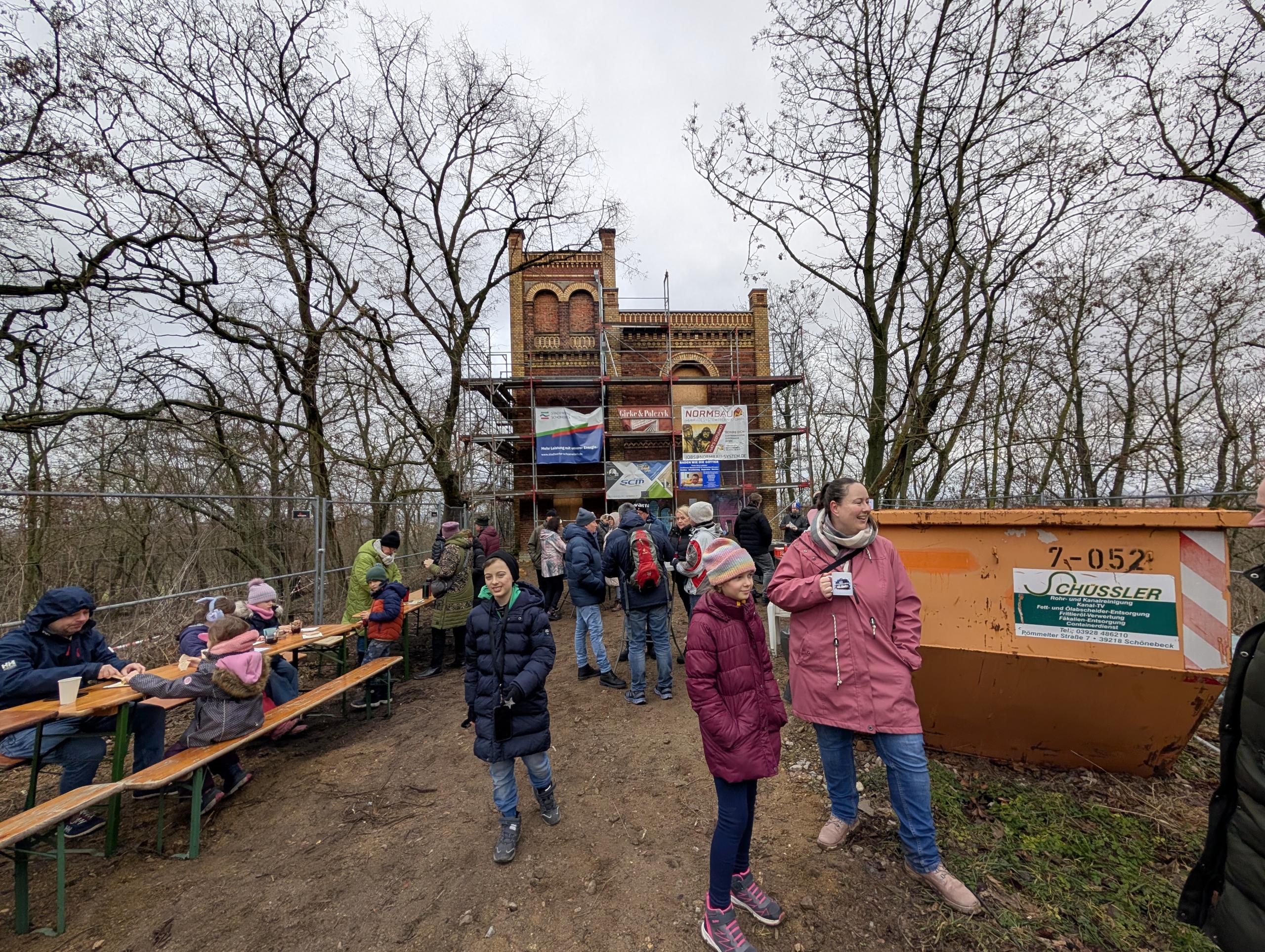 Am vergangenen Wochenende zog es zahlreiche Bürgerinnen und Bürger zu einem Spaziergang auf den Schönebecker Hummelberg. Dort informierten sie sich über den Hummelberg-Turm sowie die Vereinsarbeit und verfolgten interessiert den aktuellen Baufortschritt an der ehemaligen Sternwarte. Viele Gäste folgten der Einladung des Förderverein Hummelberg-Turm e. V. und nutzten die Gelegenheit zum Austausch über persönliche Erlebnisse rund um den Turm. Auf dem Gelände vor dem Turm wurden fast 100 große und kleine Besucher mit Schmorwürstchen und Getränken versorgt. Für die hohe Besucherzahl, die großzügigen Spenden und die ausgelassene Stimmung bedankten sich der Vorsitzende Friedrich Allendorff sowie sein Stellvertreter Christian Jakobs herzlich. Die Mitglieder des Fördervereins hatten einen weiteren Grund zur Freude. Pünktlich zur Veranstaltung kam der Zuwendungsbescheid für LEADER-Projekte in Sachsen-Anhalt (Förderperiode 2023–2027) in Höhe von 160.000 Euro an. Die Vorstandsmitglieder bedanken sich für die großartige Unterstützung aller Beteiligten und planen schon die nächsten Projekte. Im Frühjahr soll es mit den weiteren Baumaßnahmen weitergehen.
