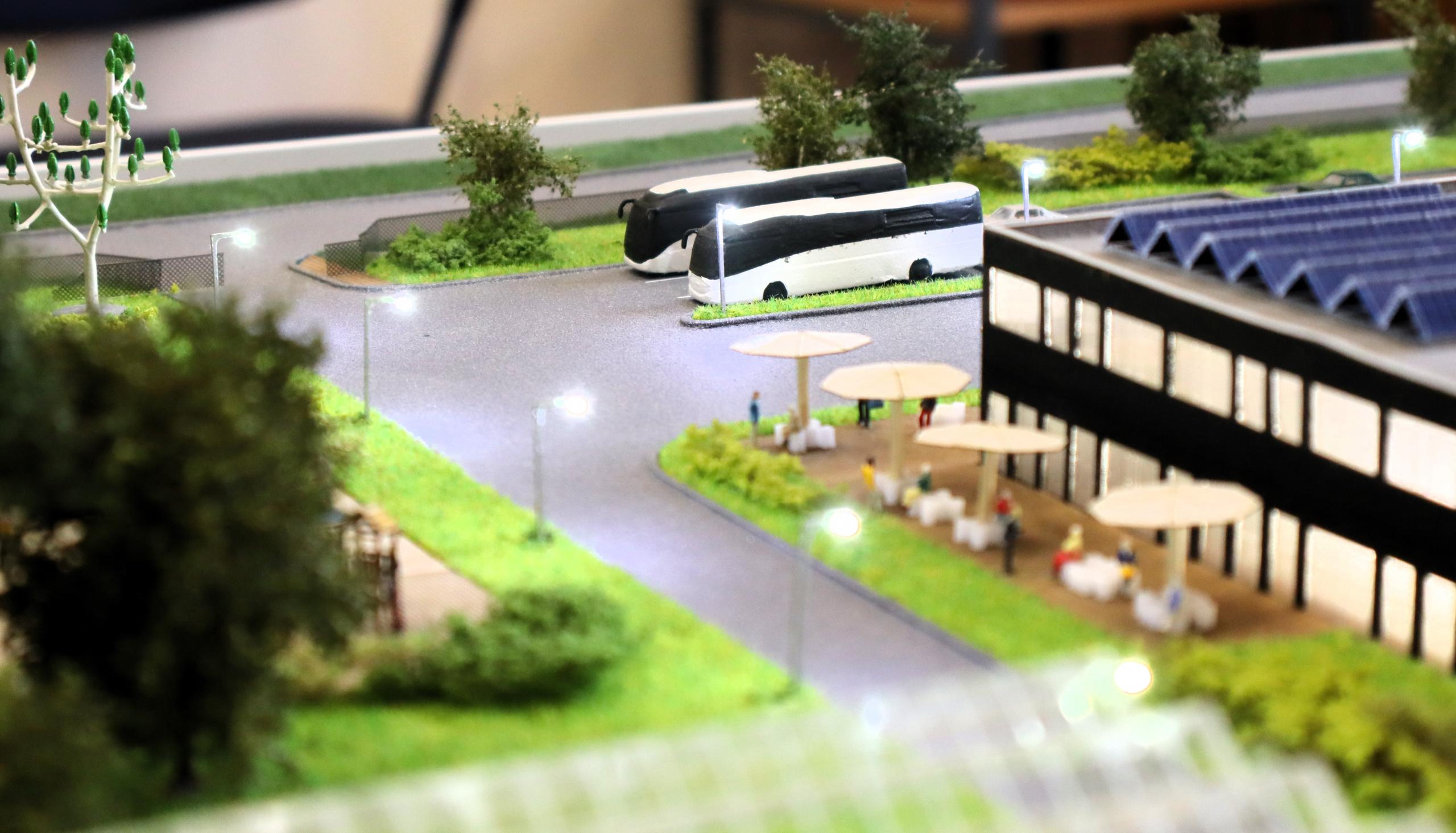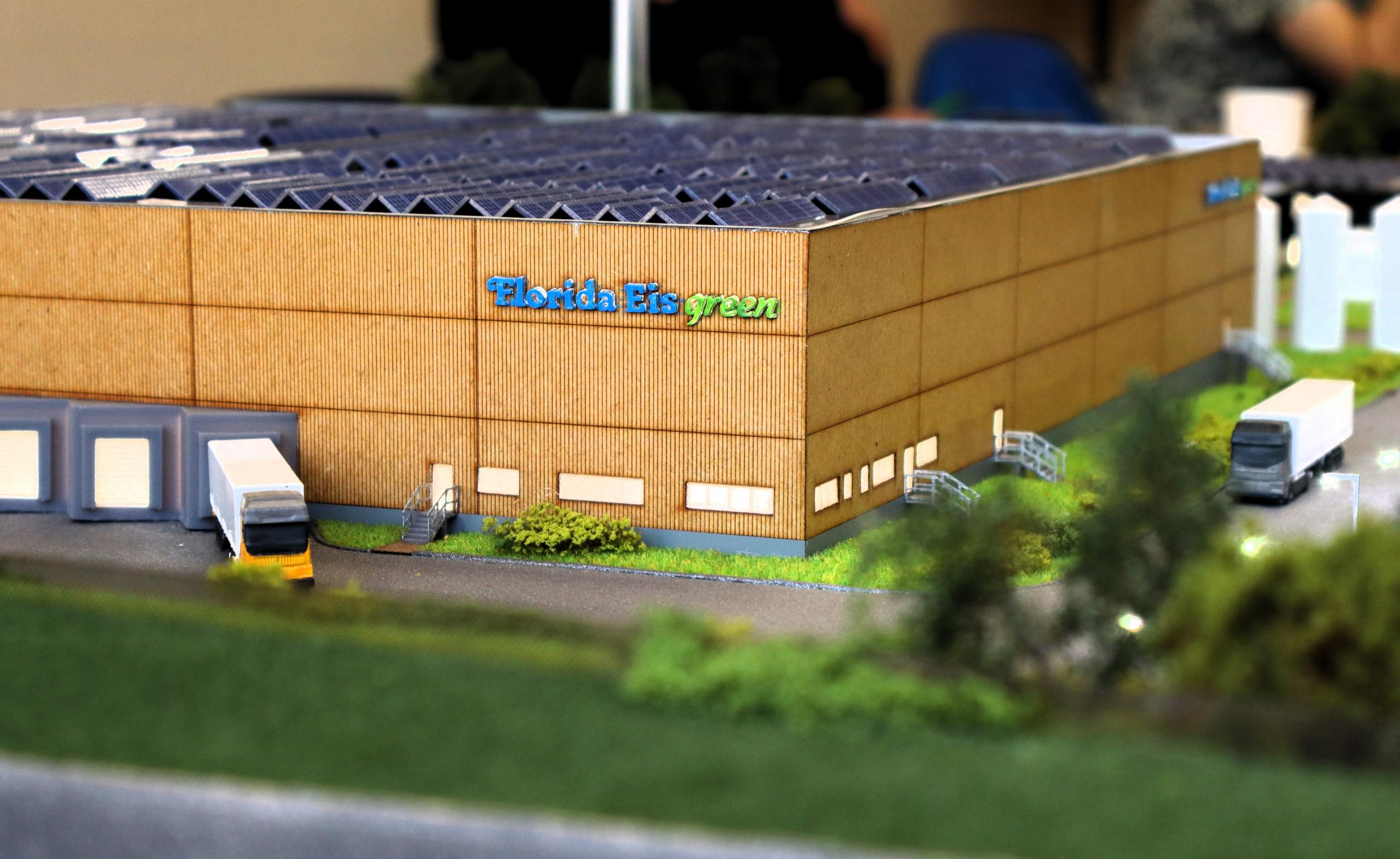 Zwischen den Standorten Berlin und Schönebeck setzt Höhn – wie bei der kompletten Baumaßnahme und Produktion – auf Autarkie. Die LKW sollen möglichst mit Wasserstoff unterwegs sein. Dieser wird auf dem Gelände in Schönebeck produziert, unter anderem mit Wind- und Solarstrom, von dem die technischen Einrichtungen auf dem Gelände am Tag bis zu 2 Megawatt produzieren. „Wir wollen zu mindestens 98 Prozent autark wirtschaften.“ Dazu wird für die Hallen in Holzbauweise auch Bambus in Erwägung gezogen, wenngleich dieser Werkstoff „aktuell sehr teuer ist“. Bis es so weit ist, gibt es das Firmengelände von Florida-Eis in Schönebeck zum Anfassen nur in Kleinformat.