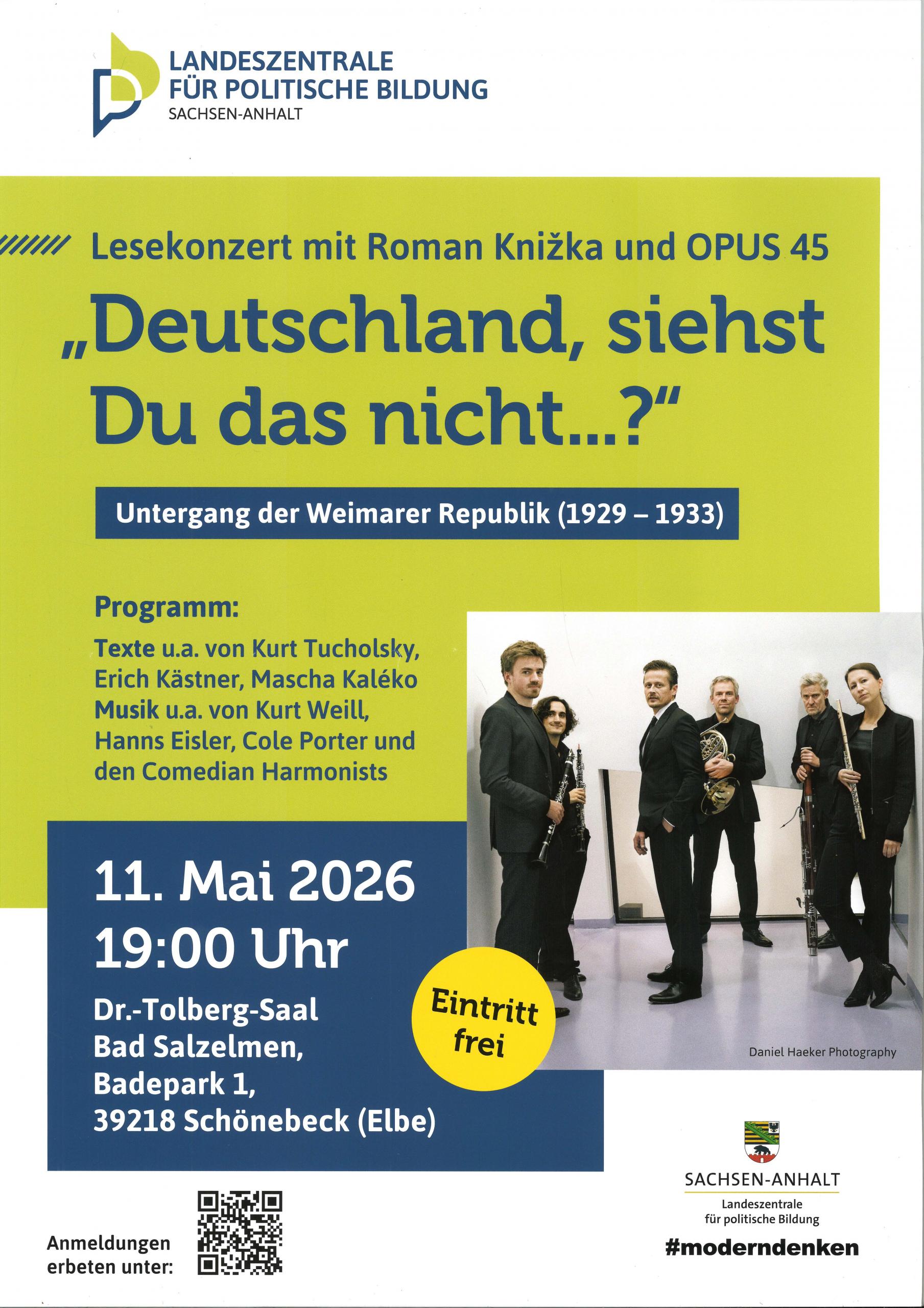 In ihrem neuen Programm begeben sich Roman Knižka und OPUS 45 in die dramatische wie schillernde Schlussphase der Weimarer Republik. Der Titel greift dabei eine eindringliche Zeile aus Kurt Tucholskys Gedicht „Deutschland, erwache!“ von 1930 auf. Es ist ein scharf formulierter Warnruf vor Radikalisierung, Gewalt und dem Zerfall demokratischer Normen und er fällt in die letzten Jahre der Weimarer Republik, die wenige Jahre später mit der Machtübernahme der Nationalsozialisten ihr Ende fand.