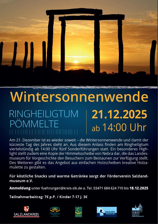 Am 21. Dezember ist es wieder soweit – die Wintersonnenwende und damit der kürzeste Tag des Jahres steht an. Aus diesem Anlass finden am Ringheiligtum viertelstündig ab 14:00 Uhr fünf Sonderführungen statt. Ein besonderes Highlight stellt zudem eine Kopie der Himmelsscheibe von Nebra dar, die das Landesmuseum für Vorgeschichte den Besuchern zum Bestaunen zur Verfügung stellt. Des Weiteren gibt es das Angebot aus einfachen Holzscheiben kreative Holzamulette zu gestalten. Für köstliche Snacks und warme Getränke sorgt der Förderverein Salzlandmuseum e.V. Anmeldung unter fuehrungen@kreis-slk.de o. Tel. 03471 684 624 710 bis 18.12.2025 Teilnehmerbeitrag: 7€ p.P. / Kinder 7-17 J. 3€