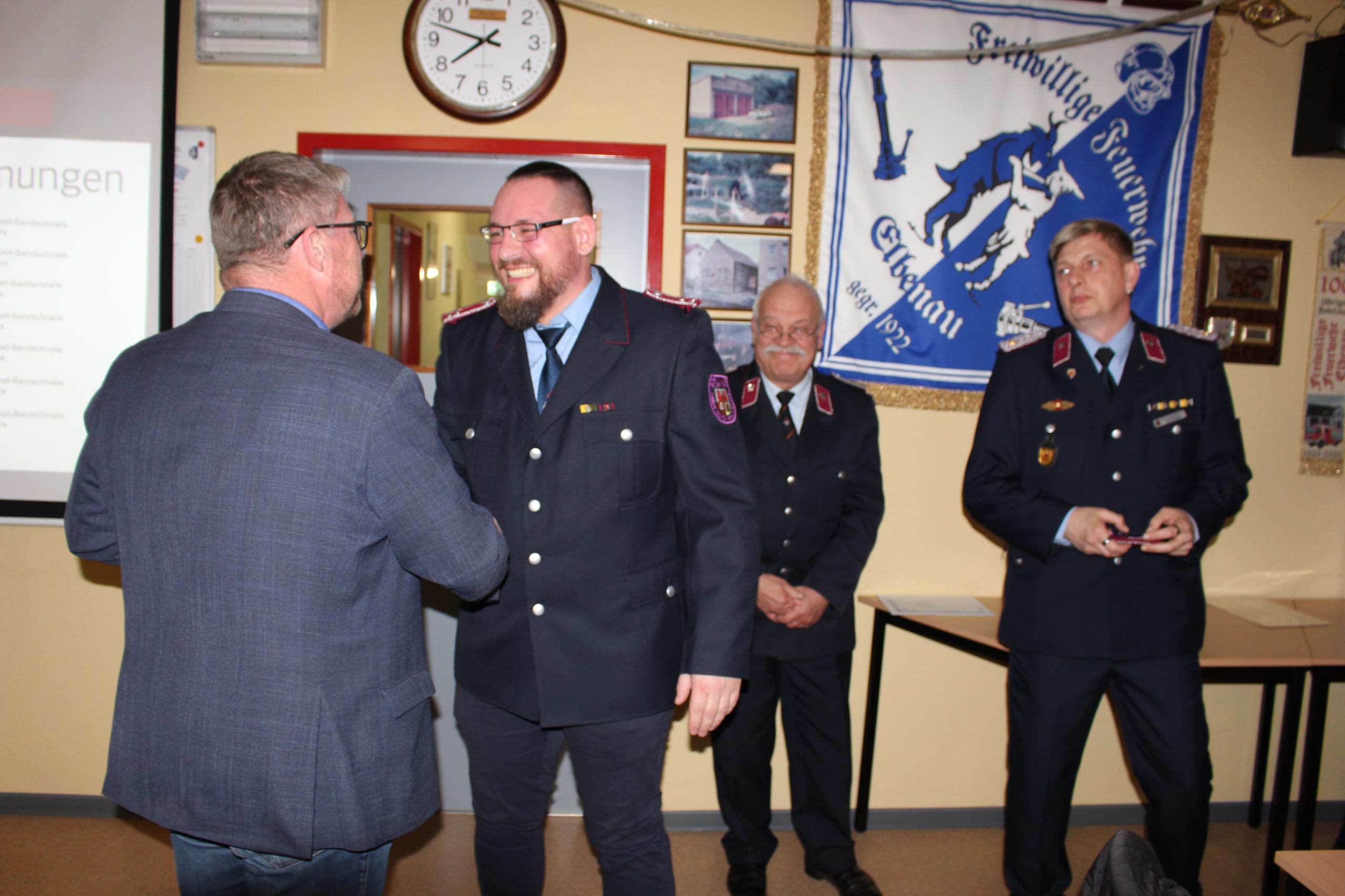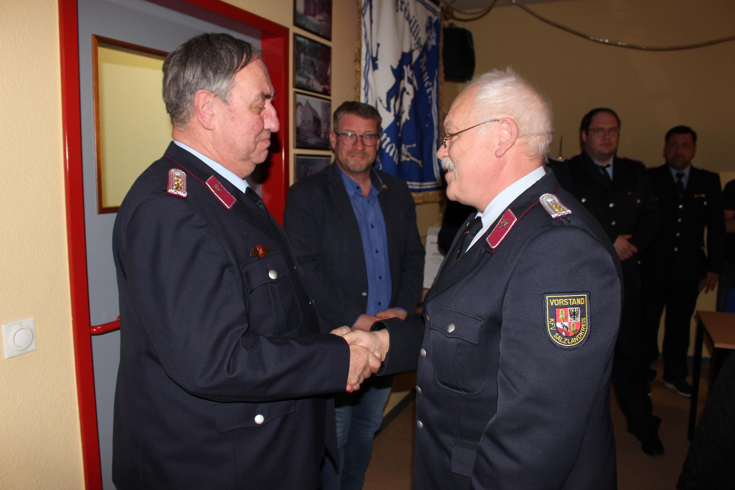 Lothar Meyer, Verbandsvorsitzender des Kreisfeuerwehrverband Salzlandkreis e.V., bedankte sich im Namen des Landkreises und wünschte den Kameraden eine stets gesunde Rückkehr von den Einsätzen. Zur Überraschung der anwesenden überbrachte der Vorsitzender des Kreisfeuerwehrverbandes eine besondere Würdigung nach Elbenau. Im Auftrag des Deutschen Feuerwehrverbandes steckte Lothar Meyer Ronald Mühlsiegel das Feuerwehr-Ehrenkreuz in Silber an. Der ehemalige Stadtteilwehrleiter wurde für sein jahrzehntelanges Engagement gewürdigt.