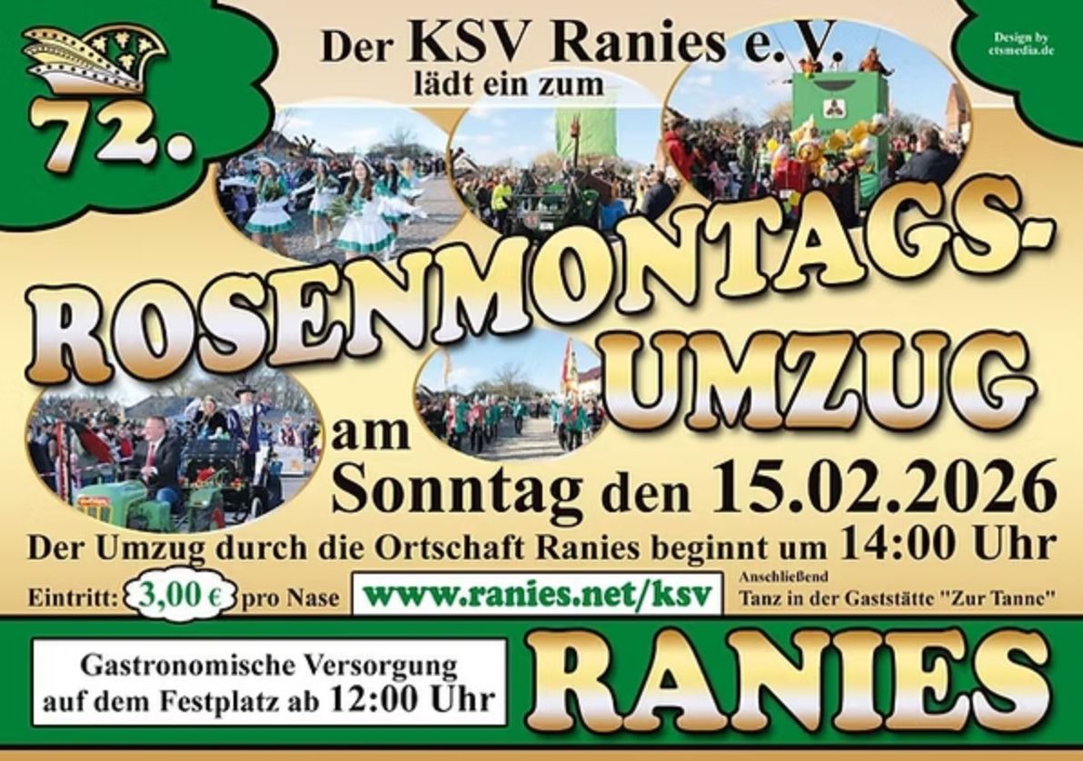 Das Traditionsgefühl und die Heimatverbundenheit der Ranieser werden in zahlreichen Festen zum Ausdruck gebracht. Dabei ist vor allem der Ranieser Rosenmontagsumzug als kultureller Höhepunkt für alle Karnevalsfreunde weit über die Landesgrenzen bekannt. Der Straßenkarneval beginnt um 14 Uhr. Anschließend findet der Tanz in der Gaststätte "Zur Tanne" statt. Die Gastronomische Versorgung auf dem Festplatz beginnt ab 12 Uhr. Für Speis und Trank vor, während und nach der dem Festumzug ist gesorgt. Bitte folgen sie den Einweisungen der Parkplatzordner(innen). Nähere Informationen unter: Kultur-und Sportverein Ranies e.V.