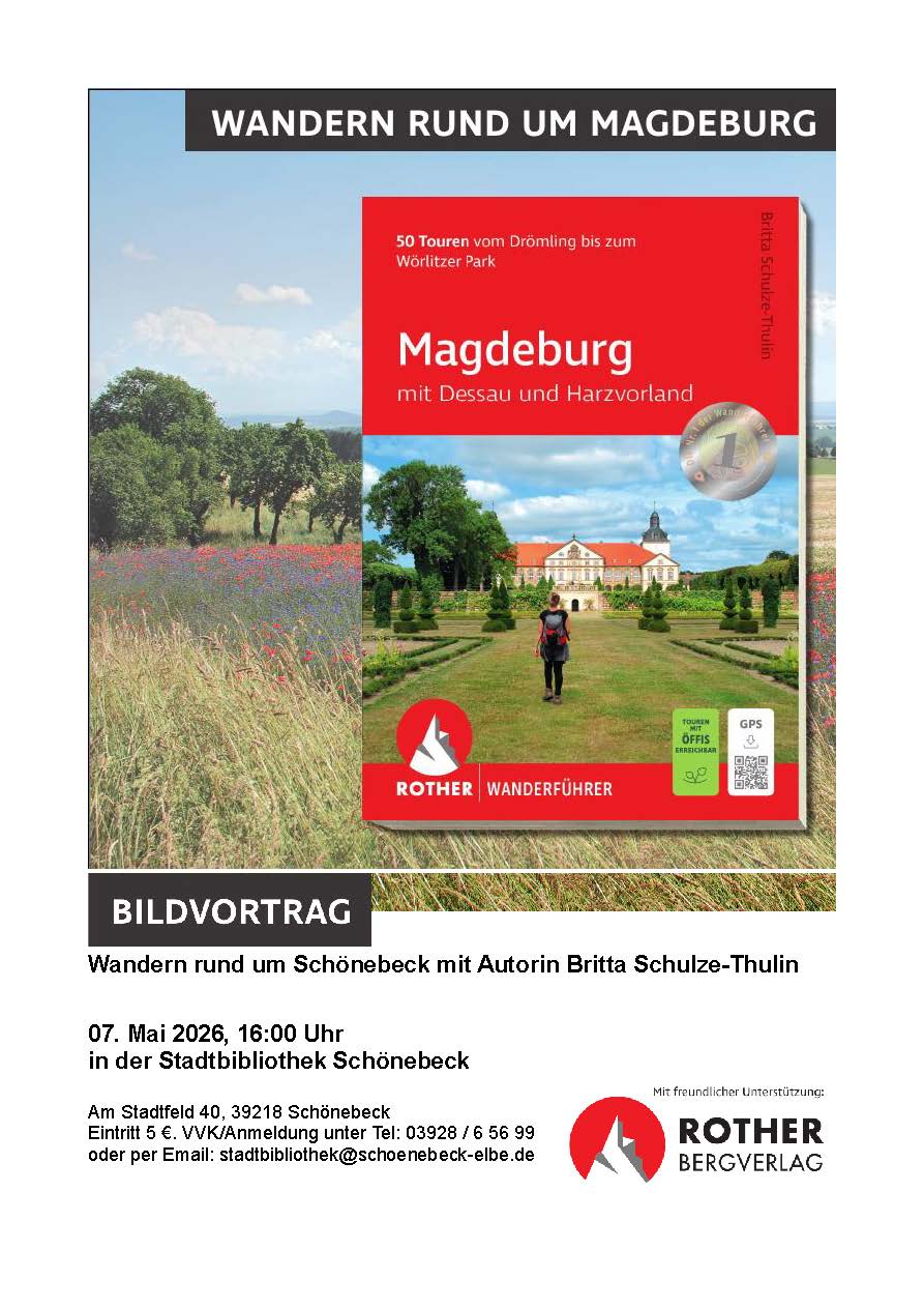 Wandern Sie gerne und für einen Tagesauflug soll es nicht immer in den Harz oder die Altmark gehen? Dr. Britta Schulze-Thulin hat sich das Entdecken der weniger bekannten Wandergebiete dazwischen zur Passion gemacht und einen Wanderführer über die Umgebung von Magdeburg geschrieben, in deren Herzen auch Schönebeck liegt. Die Region bietet auf engem Raum eine Fülle von unterschiedlichen Landschaften, die sich auf Schusters Rappen bestens erkunden lassen. In reizvollem Kontrast stehen die unterschiedlichen Naturräume von Mittelelbe, Westlichem Fläming mit Colbitz-Letzlinger Heide, der Börde und nördlichem Harzvorland zueinander und bedingen eine attraktive Verschiedenartigkeit der Landschaften. Die Autorin zeigt, wo das alles von Schönebeck aus zu finden ist, untermalt von Bildern eines herrlichen Wandergebiets.