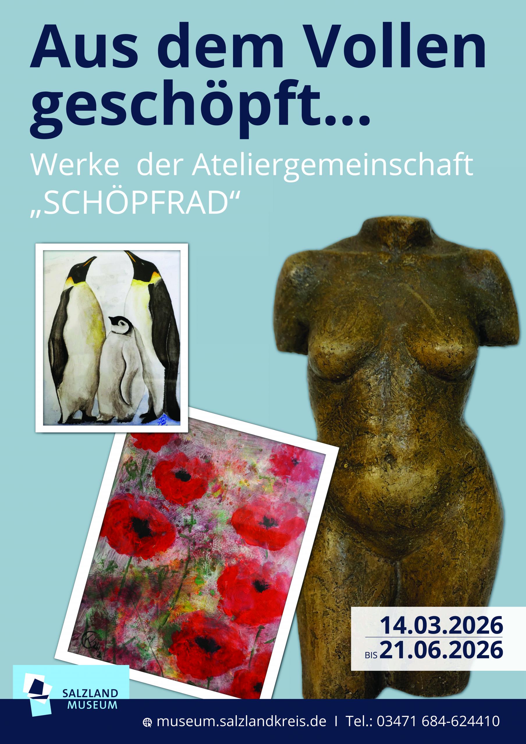 „Aus dem Vollen geschöpft…“ könnte für das Programm gelten, ist aber der Titel der Kunstausstellung im Haus, die an diesem Abend eröffnet wird. Vom 14. März bis 21. Juni gibt es vielfältige Werke der Ateliergemeinschaft Schöpfrad zu sehen, einige sind nur für diese Sonderausstellung entstanden: Kunstwerke mit Motiven zum Beispiel vom Salzlandmuseum, Kurpark oder Gertraudenfriedhof in Bad-Salzelmen. Und Liebhaber erhalten die Chance, sie zu erwerben.