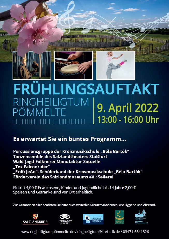 Endlich Frühling! Jetzt startet die Saison am Ringheiligtum Pömmelte mit einem Fest. Am Samstag, 9. April, heißt es in der Zeit von 13 bis 16 Uhr wieder „Frühlingsauftakt“ mit Musik und Tanz. Die Eröffnung übernehmen Landrat Markus Bauer und Landtagspräsident Gunnar Schellenberger, der gleichzeitig auch Vorsitzender des Kreisentwicklungsausschusses ist. Sie freuen sich beide auch ganz persönlich über das weitere Aufblühen der touristischen Anlage in der heimischen Region.